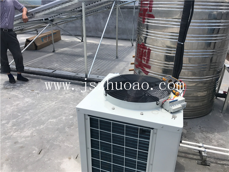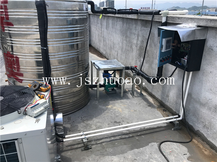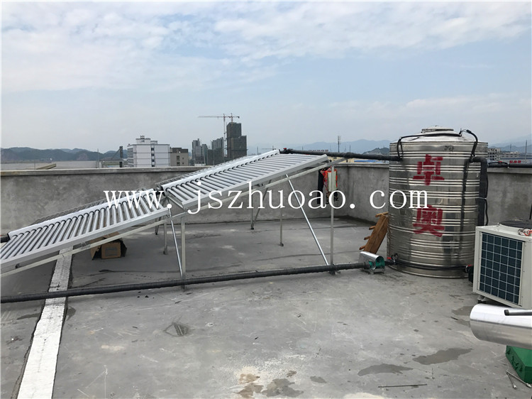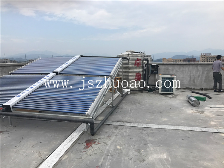 該項(xiàng)目使用2組太陽(yáng)能集熱器,配置一臺(tái)2噸保溫水箱,一臺(tái)3匹商用空氣能熱泵進(jìn)行輔助加熱,24小時(shí)供應(yīng)員工淋浴用水。